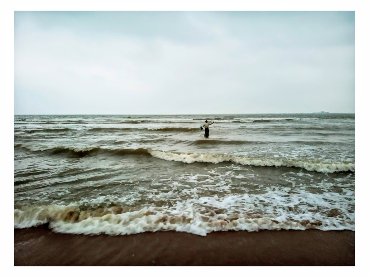 Najpierw poszliśmy nad Morze Południowchińskie – w miejsce, gdzie wpływa do niego rzeka Wuyuan. Poza nami był tam tylko jeden chłopak i wędkarz, który wszedł w ubraniu do wody, aby sprawdzić swoje sieci.