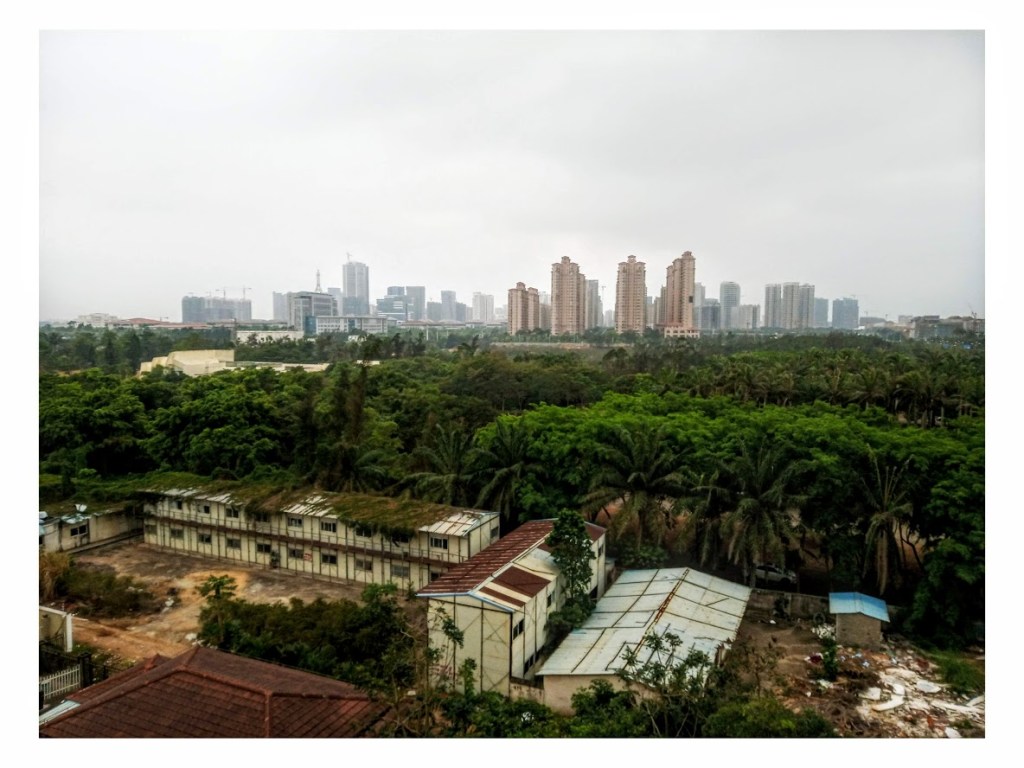 Po przylocie do Haikou (stolicy Hainanu), pojechaliśmy z lotniska taksówką do hotelu Holiday Inn Express. W pokoju był balkon z fajnym widokiem na kawałek lasu tropikalnego, za którym wyrastały bardzo wysokie budynki miasta.