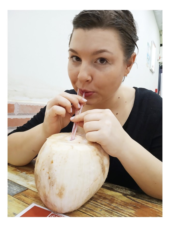 Za centrum handlowym była alejka małych knajpek z jedzeniem. Weszliśmy do jednej z nich, pokazując palcem na zdjęcia dań, które wybraliśmy – zjedliśmy smaczne glony z boczkiem (Agata) i chyba wieprzowinę (Mariusz), piliśmy też sok z kokosa przez słomkę. Jakoś paradoksalnie miał on mało kokosowy smak.