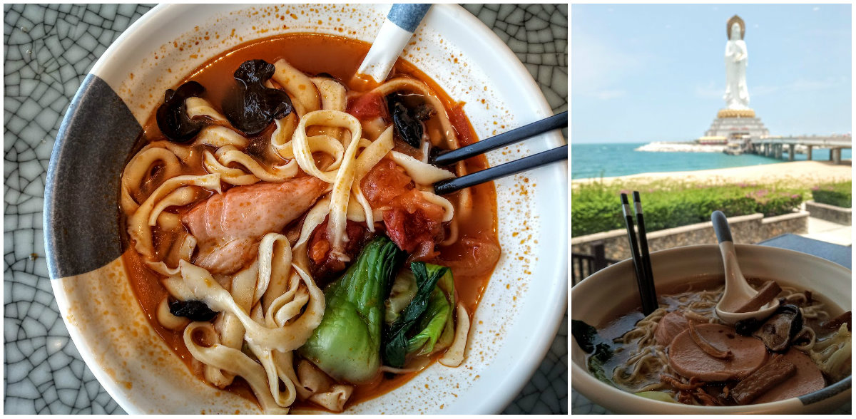 W części komercyjnej, po drodze do wielkiego posągu, znajduje się restauracja wegetariańska z wyśmienitymi ramenami z dodatkiem ręcznie robionego makaronu (na widoku, w otwartej kuchni). Warto wybrać się tam na obiad. Ceny są rozsądne, a porcje spore. Jedna z lepszych rzeczy, jaką przyszło nam jeść podczas całej podróży na Hajnan.