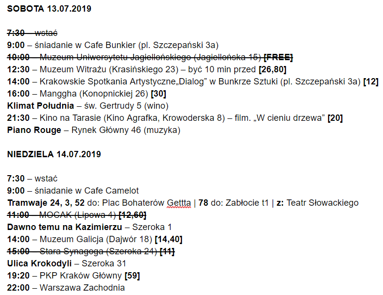 Zamieszczam tu mój przykładowy plan wyprawy do Krakowa na weekend. Przekreśliłam w nim punkty, których nie udało mi się zrealizować.