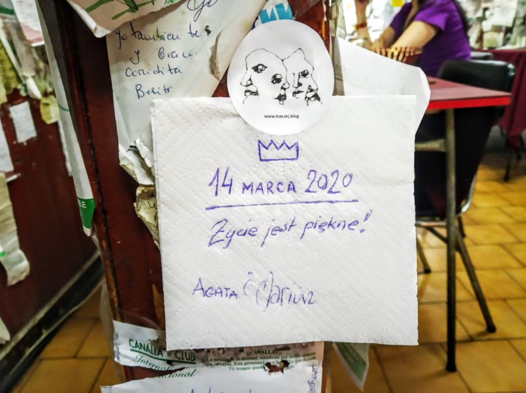 Wszystkie ściany restauracji są pokryte karteczkami i serwetkami, na których swoje myśli uwieczniają od wielu lat goście. Dołożyliśmy swoją cegiełkę, pisząc po polsku „Życie jest piękne”, bo po kilku łykach czerwonego, wytrawnego trunku i przy dźwiękach muzyki, którą uraczył nas miły starszy pan – takim się nam ono wtedy wydawało. Stres na chwilę minął. Zapanowała radość i poczuliśmy swego rodzaju ulgę.